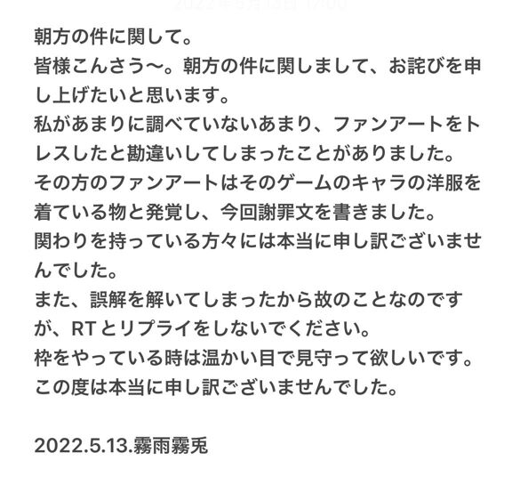 霧雨霧兎「謝罪文です。皆様こんさう~」