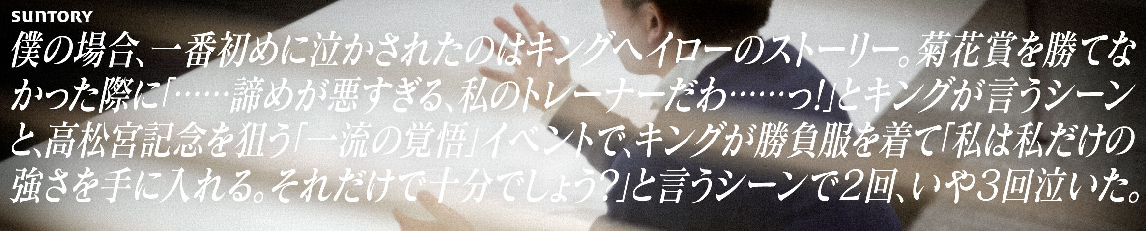 初めまして。私はサントリーという会社で、缶コーヒーBOSSの商品開発を担当している者です。私事で恐縮ですが、趣味は競馬で、ちょこちょこ馬券を買いはじめて6年ちょっと。競馬にハマったきっかけは、2015年12月27日日曜日の有馬記念。奇しくもゴールドシップの引退レースでした。