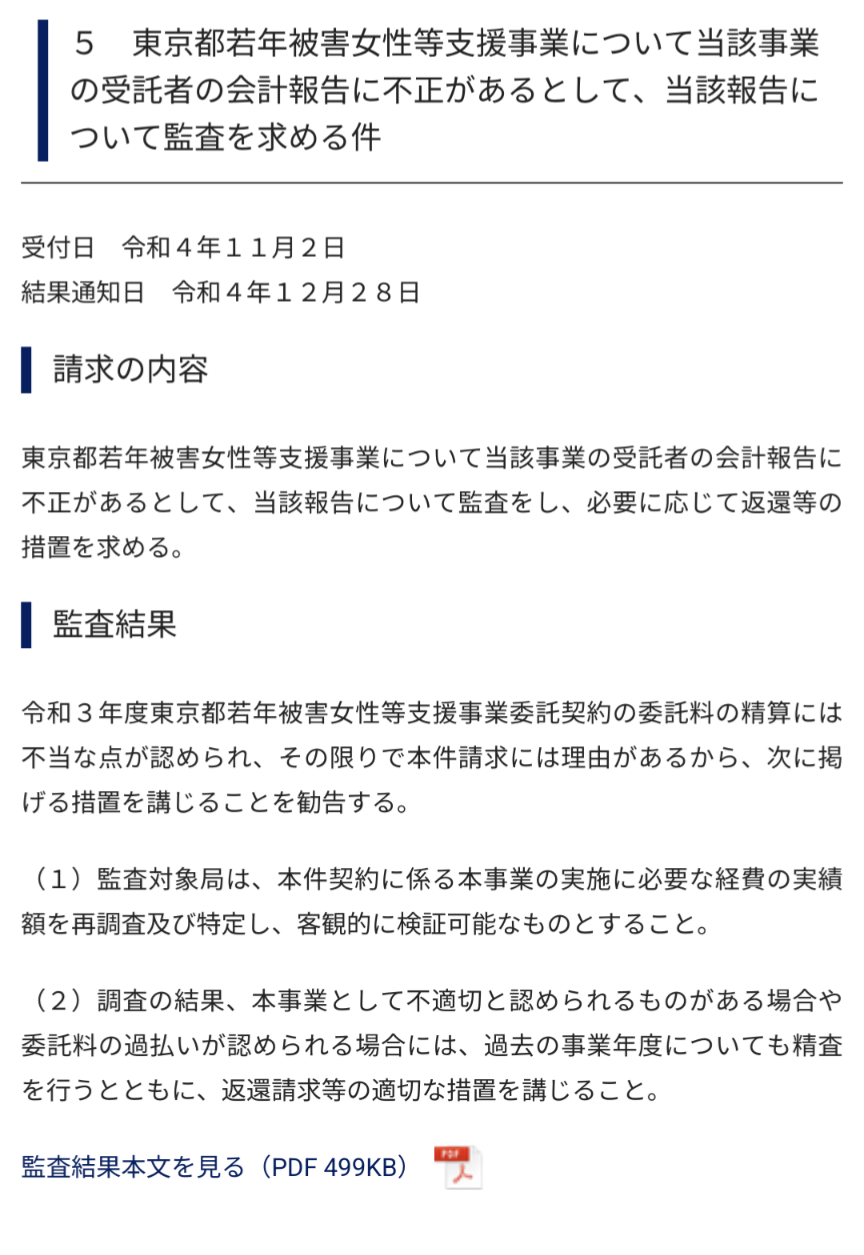 (2)調査の結果、本事業として不適切と認められるものがある場合や委託料の過払いが認められる場合には、過去の事業年度についても精査を行うとともに、返還請求等の適切な措置を講じること。