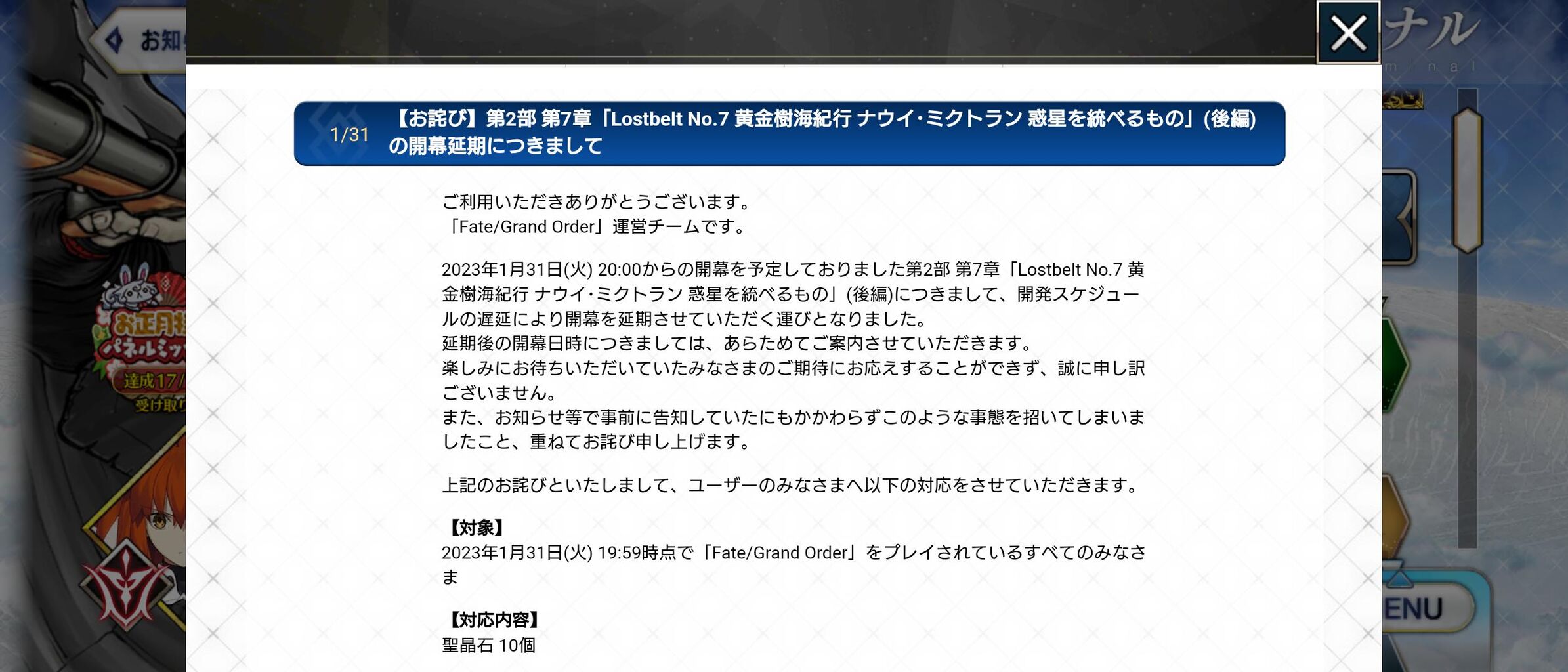 【重要】1月31日(火)20:00からを予定していた第2部 第7章(後編)の開幕を延期させていただきます。みなさまのご期待にお応えできず誠に申し訳ございません。延期後の日程についてはあらためてご案内いたしま… https://t.co/KkwDIk31g3