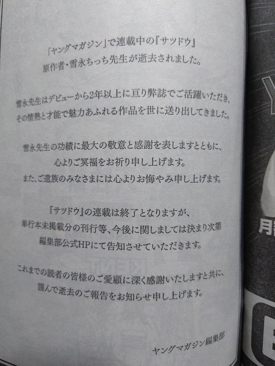 「ヤングマガジン」で連載中の『サツドウ』 原作者・雪永ちっち先生が逝去されました。