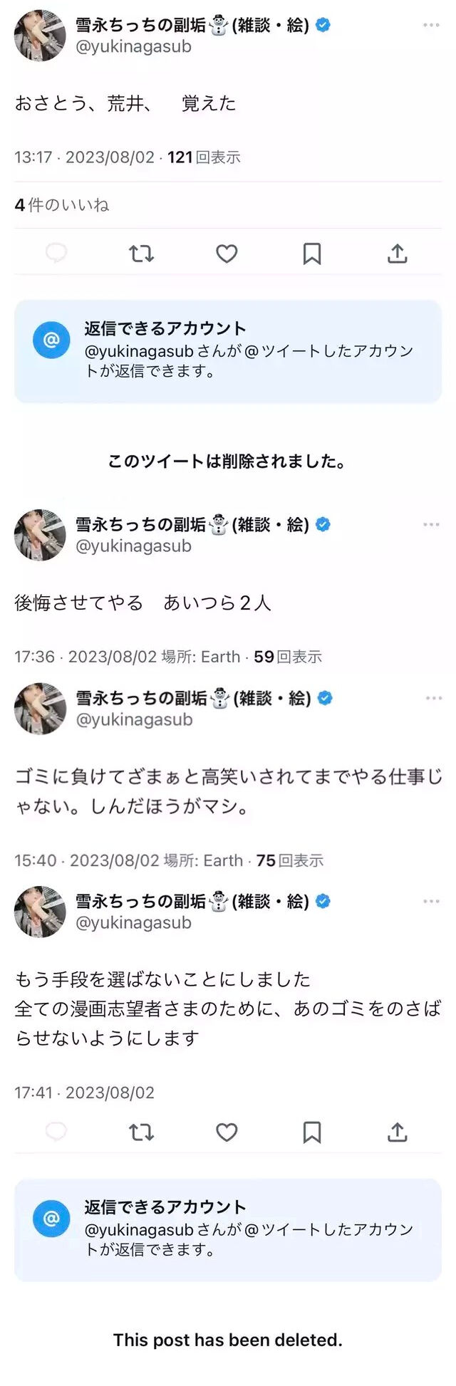 【補足】雪永氏が同じヤンマガで連載中の漫画家(“ヤニねこ”の作者)に5chやX等で誹謗中傷を行っていた事件については先日ツイートしましたが、その後講談社がヤニねこ作者&雪永氏を交えて三者で和解に向けて話し合いを進めようとしたものの、雪永氏が話し合いに応じず事態は停滞していたところでした。… pic.twitter.com/QGcq9i81xg