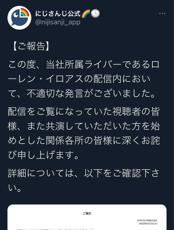 【にじさんじ】差別的発言でまた炎上したローレンさんに対する、えにからの処分・対応の改善を求める署名活動が始まる 2022年06月14日 カテゴリ:にじさんじ炎上X(旧Twitter) 【【にじさんじ】差別的発言でまた炎上したローレンさんに対する、えにからの処分・対応の改善を求める署名活動が始まる】の続きを読む タグ :#にじさんじ