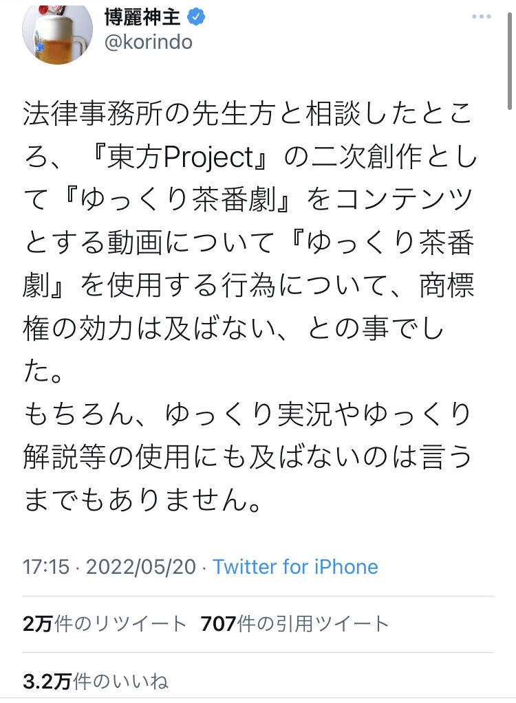 本件は『東方Project』二次創作にあたる動画の一形態「ゆっくり茶番劇」の商標権を、柚葉氏が取得したと発表したことから物議を醸していた問題です。5月20日には『東方Project』原作者サークル「上海アリス幻樂団」の主宰ZUN(神主)氏と動画投稿サイト「ニコニコ動画」を運営するドワンゴが、それぞれ声明を発表していました。