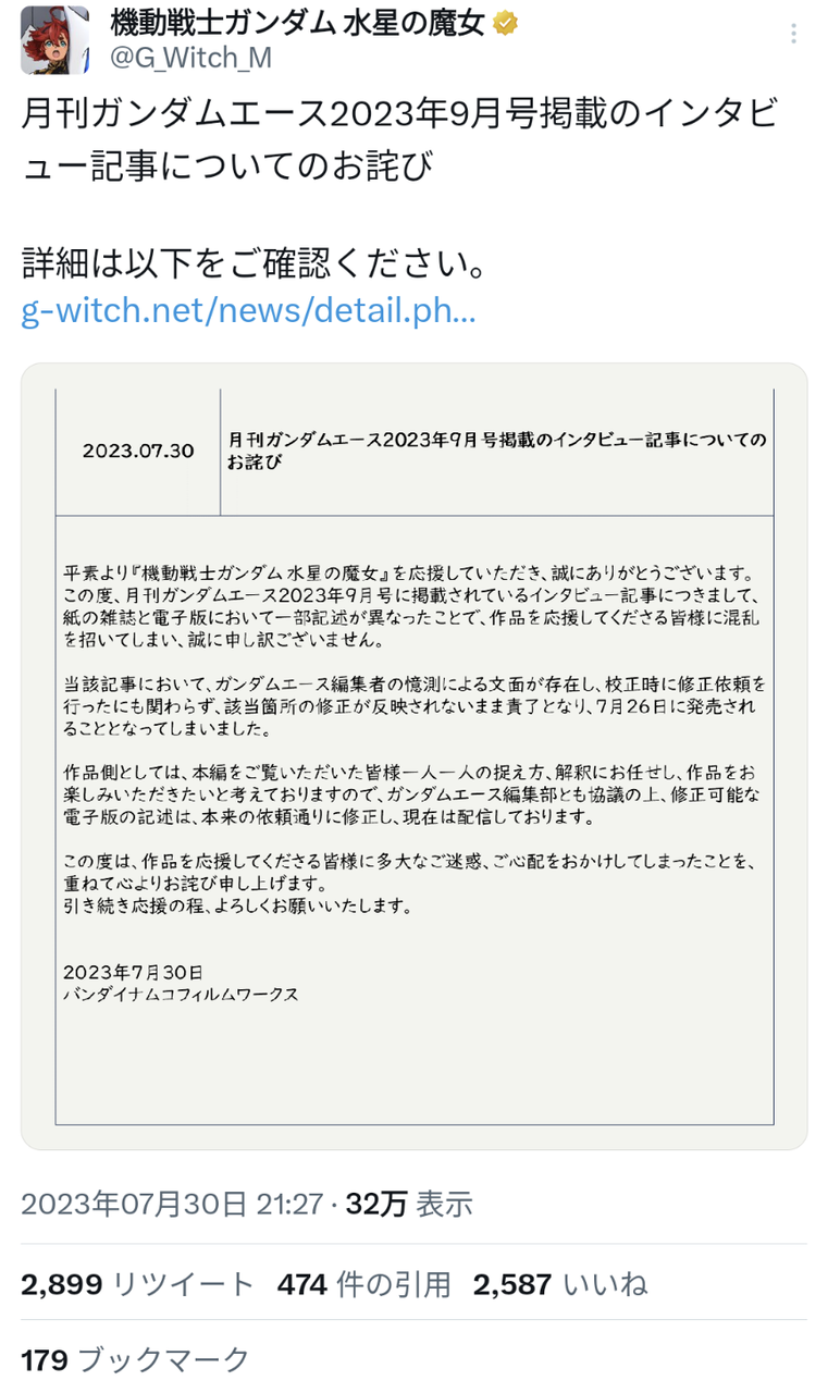 【水星の魔女】公式インタビューの文言を「憶測による文面」として削除したのはスレミオは結婚してないとするバンナムの意向か?指輪消去の不安や脚本への不満も徐々に噴出し始める
